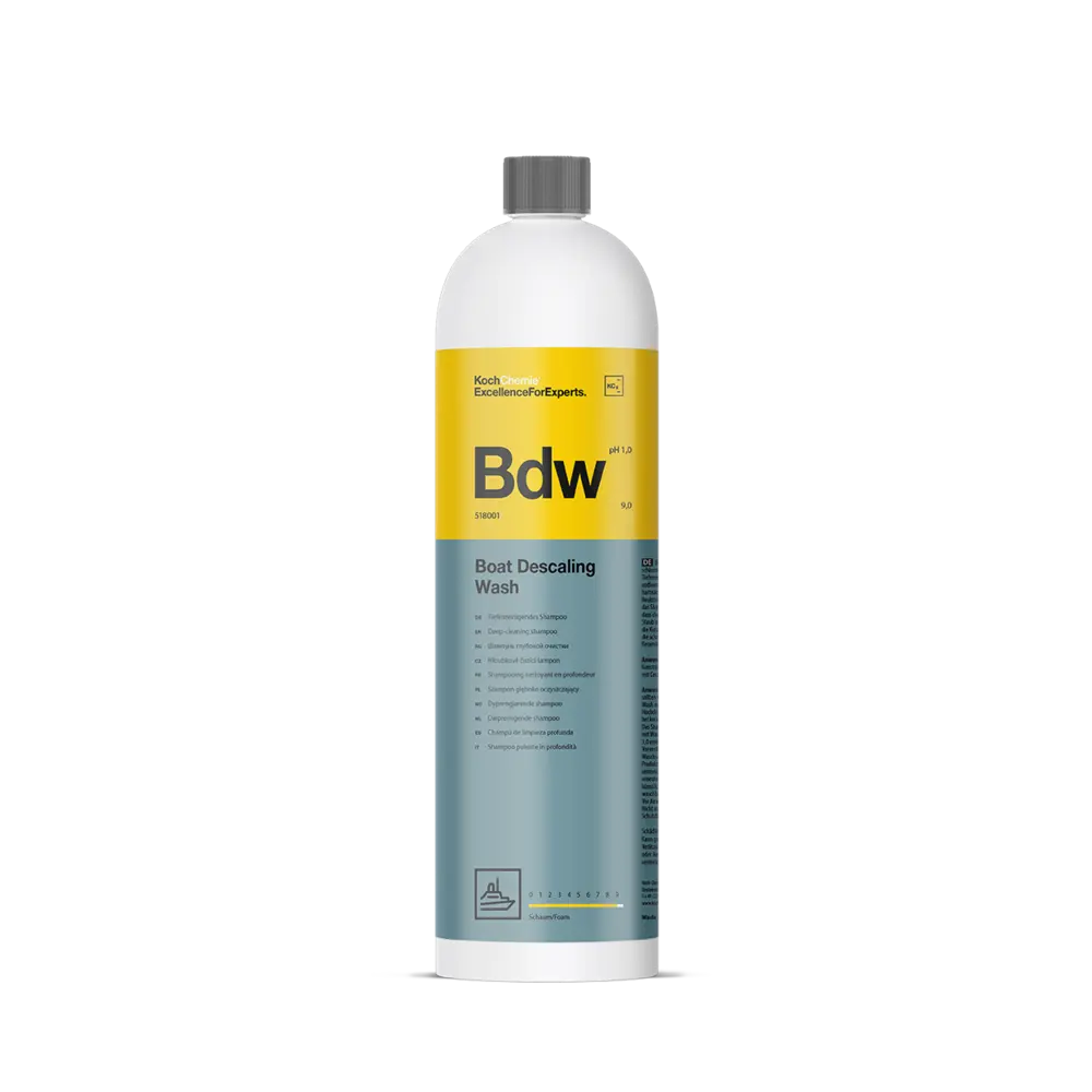 Koch Chemie Bdw Boat Descaling Wash specijalni šampon za pranje plovila napravljen je za pranje plovila koja imaju keramički premaz ili vosak u fazama kada premazi krenu pokazivati nedostatak hidrofobnosti jer su se premazi zapunili sa nečistoćom i kamencem te im je potreban šampon kiselije pH vrijednosti kako bi dubinski očistio premaz i oživio njegova svojstva.
