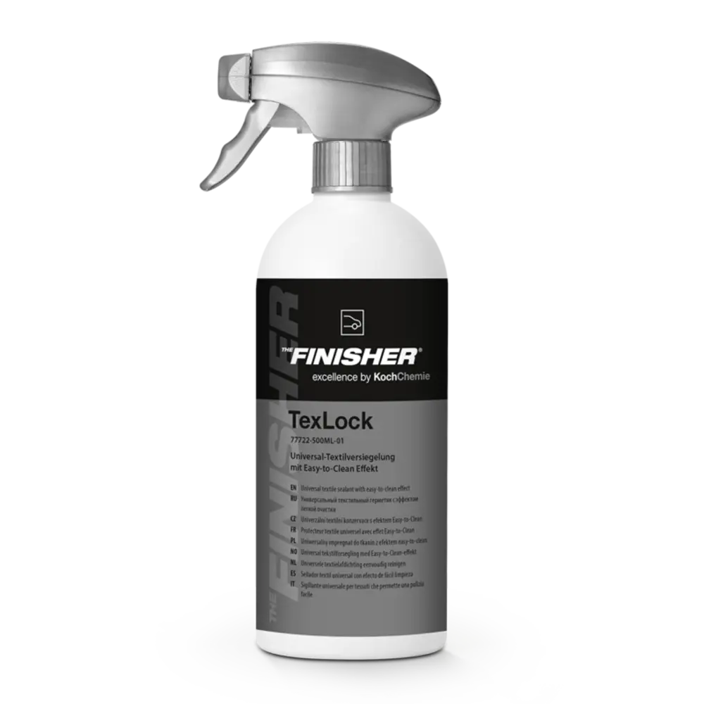 The Finisher – TexLock 500ml by Koch Chemie pouzdano štiti sve tekstilne površine poput sjedala u vozilima, tekstilnih cabrio krovova, prekrivki za automobile i sve slične tkanene površine kojima treba hidrofobna zaštita od atmosferskih utjecaja ili dnevnih nečistoća, uključujući i prolivene tekućine.